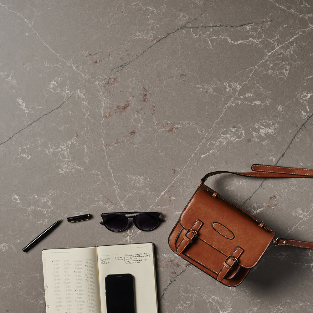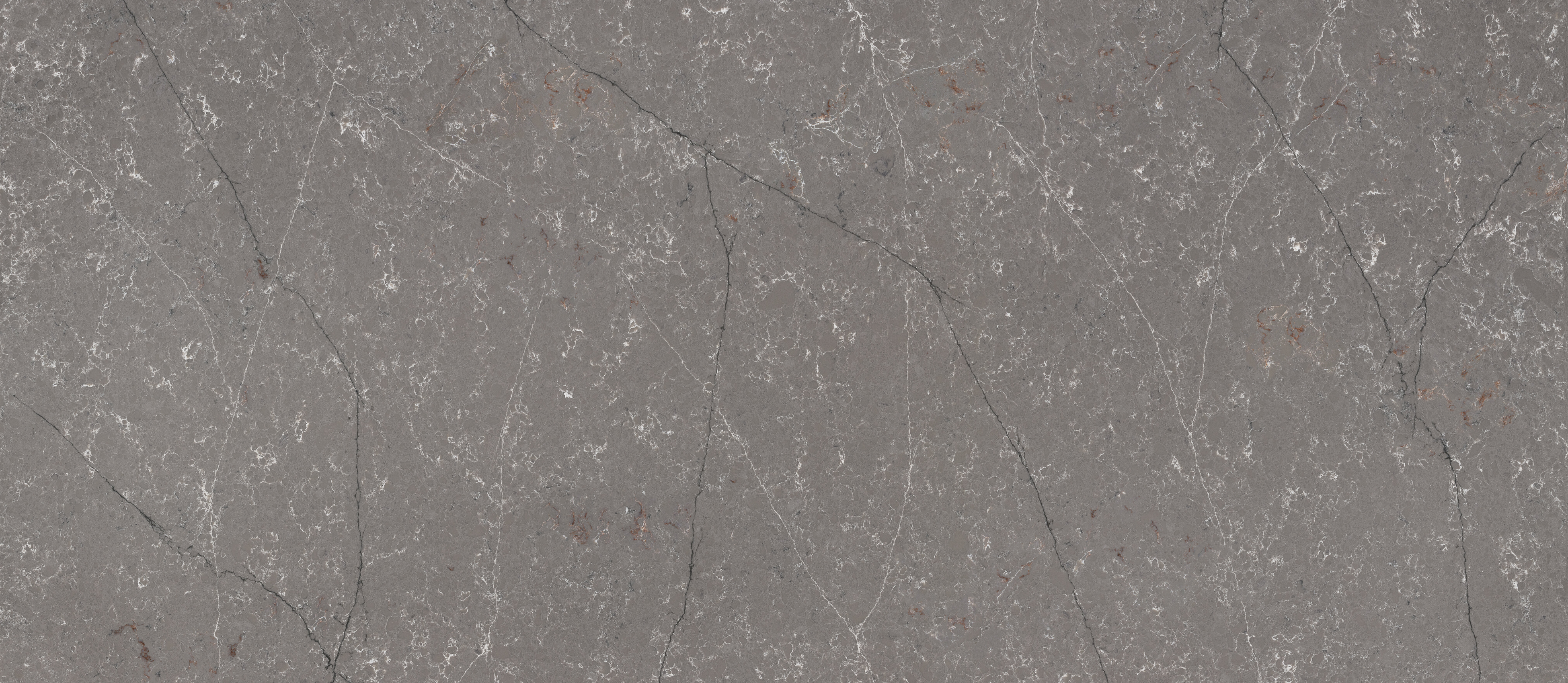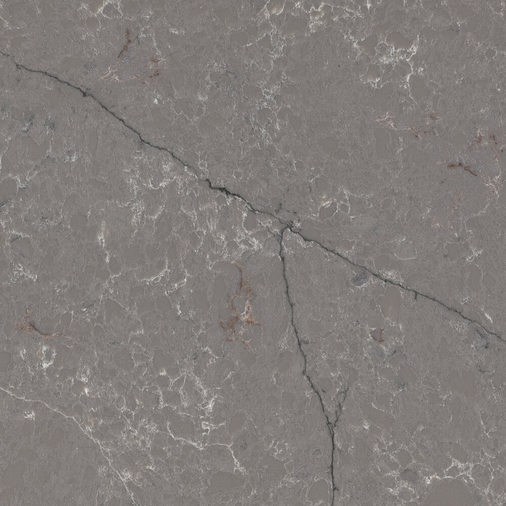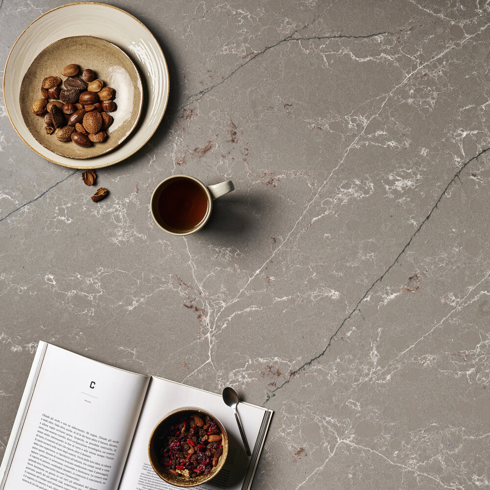 Die Forest Garrigue-Oberfläche hat einen einheitlichen grau / taubengrauen Hintergrund, eine feine Maserung, lange blaue und weiße Adern und diffuse weiße und rote Adern.