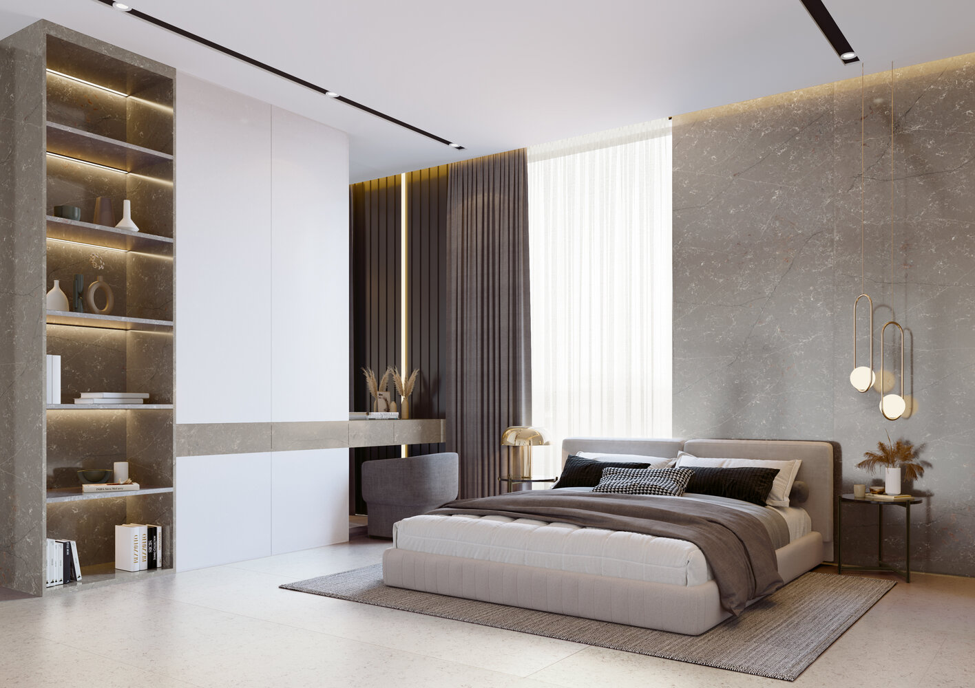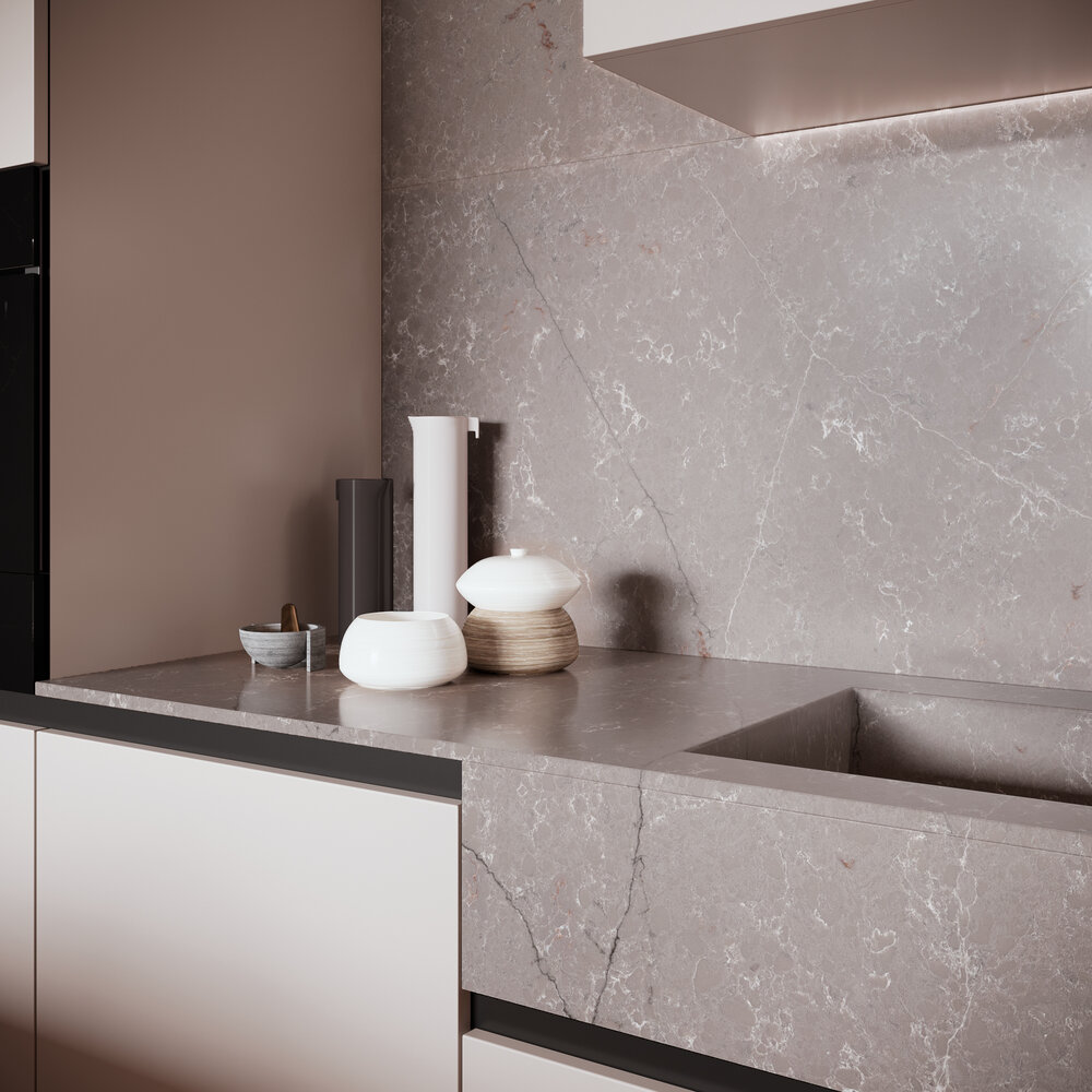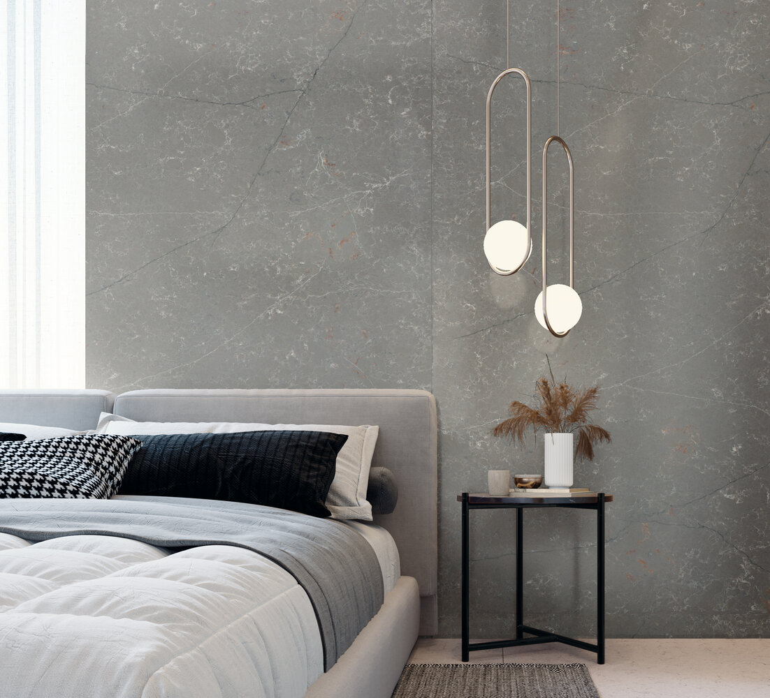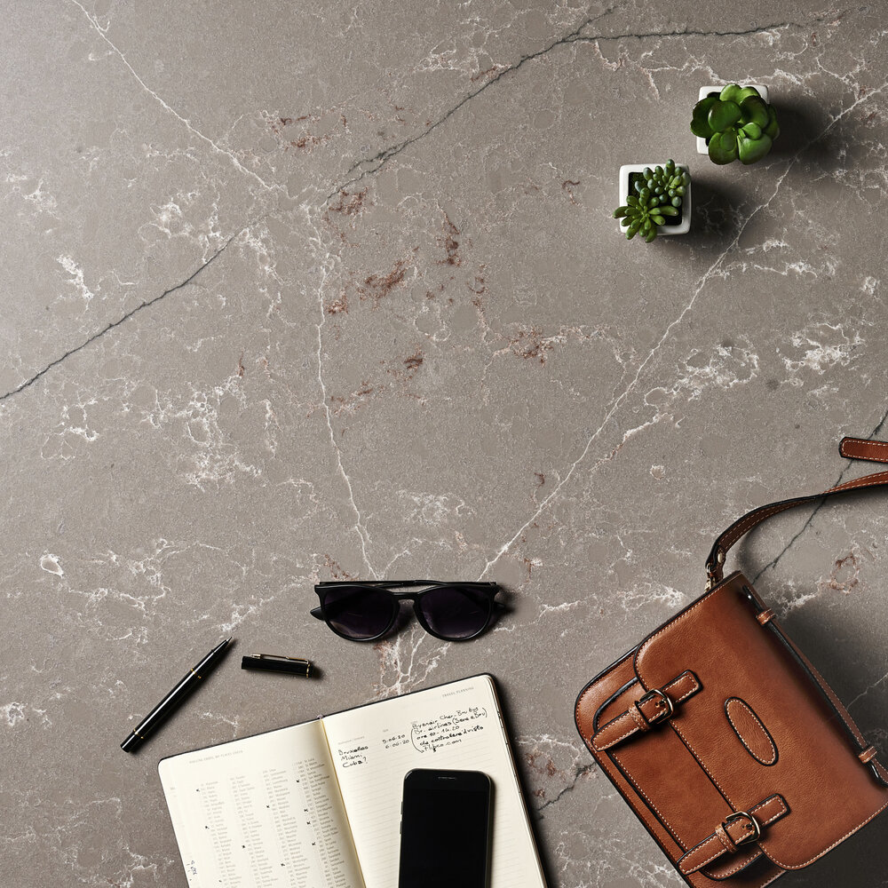 Die Forest Garrigue-Oberfläche hat einen einheitlichen grau / taubengrauen Hintergrund, eine feine Maserung, lange blaue und weiße Adern und diffuse weiße und rote Adern.