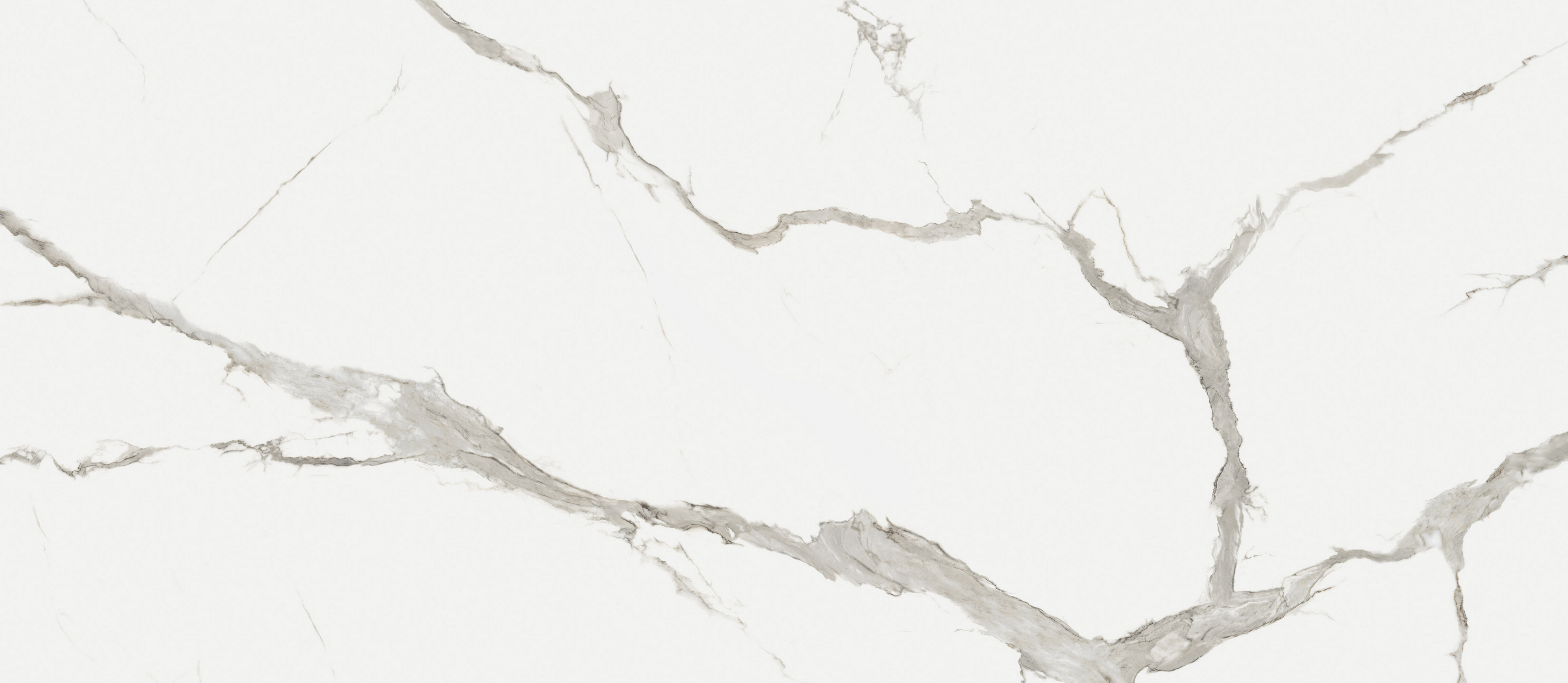 La superficie ceramica Pandora Statuario ha un fondo uniforme bianco e una grana piena e lunghe venature grigio chiaro e grigio scuro.