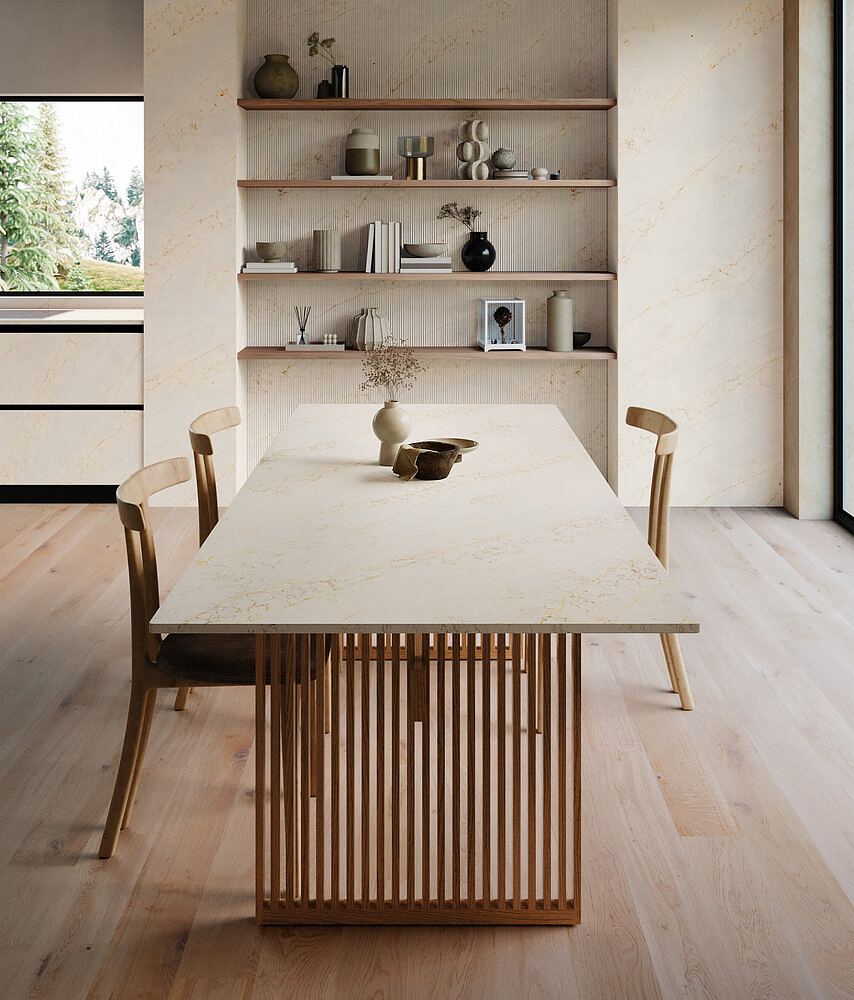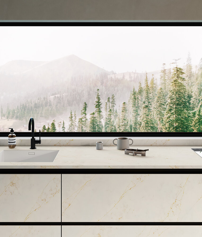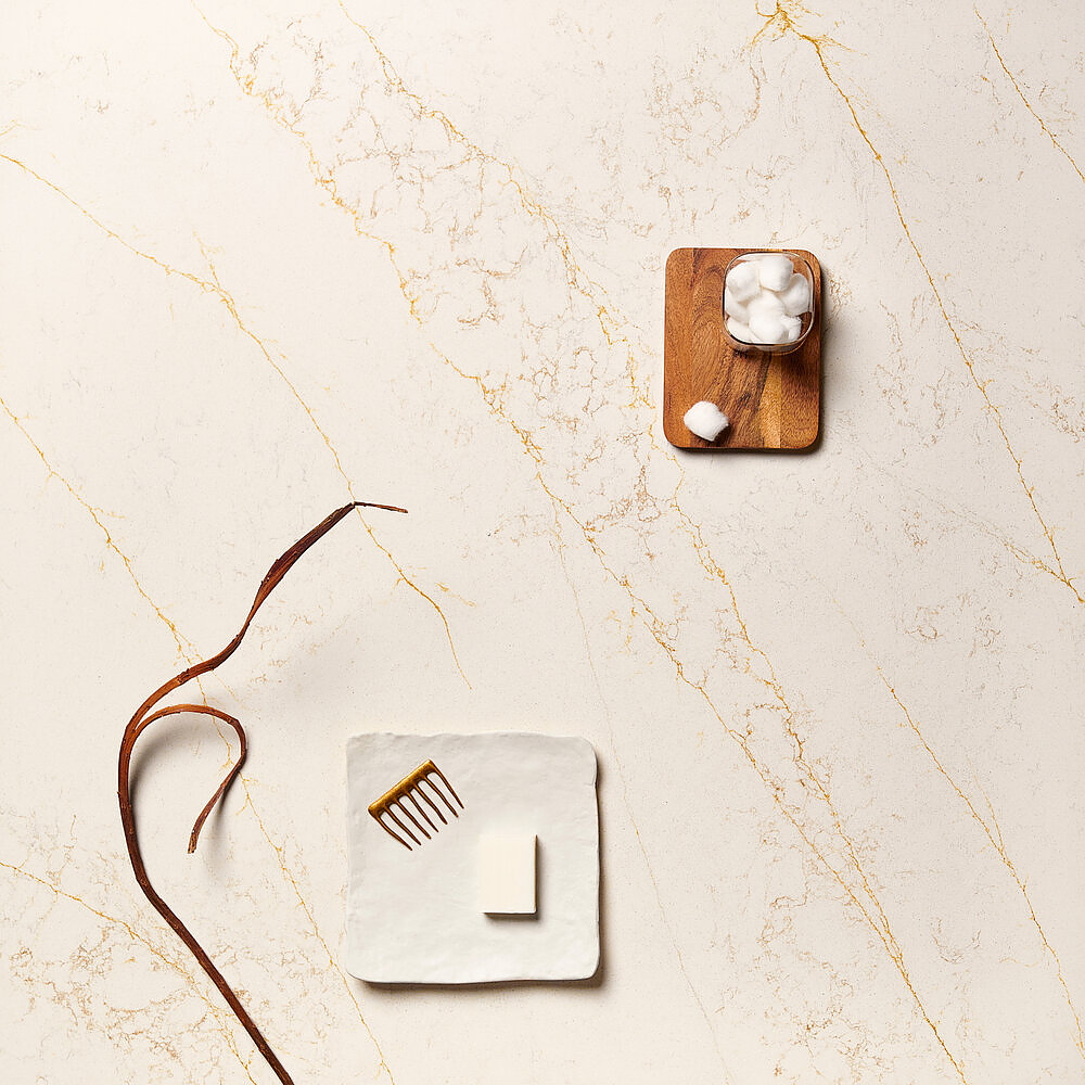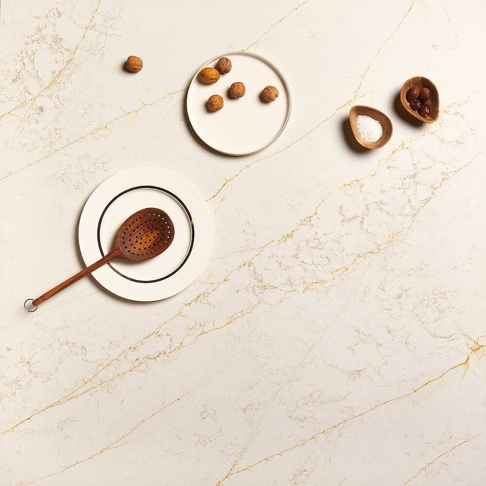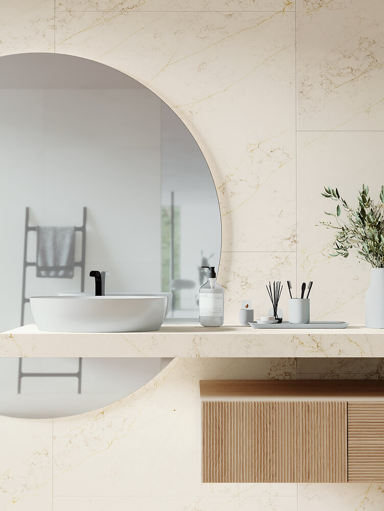A luminous marble background is enhanced by a pattern of elegant and striking golden veins. The Gold slab expresses refined classic elegance, giving interiors a distinctly decorative touch. A style that is both timeless and contemporary.