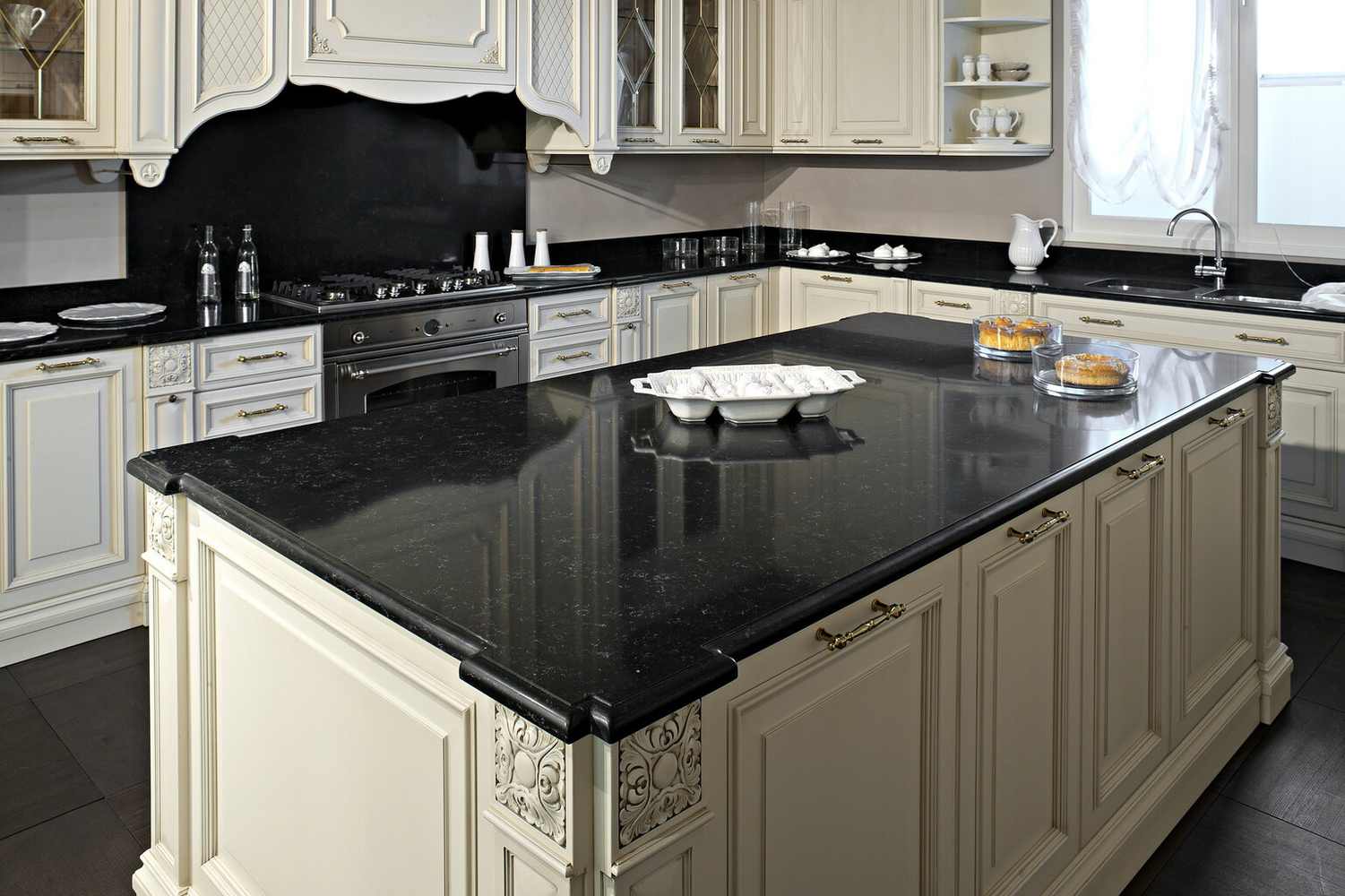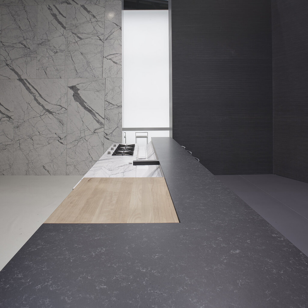 Throughout the ages, African marble has inhabited our spaces, enriching them with its bright colours and distinctive grain. The Africa quartz agglomerate slab represents its strength in a version with dark, deep and mysterious shades, dotted with small fragments of light.