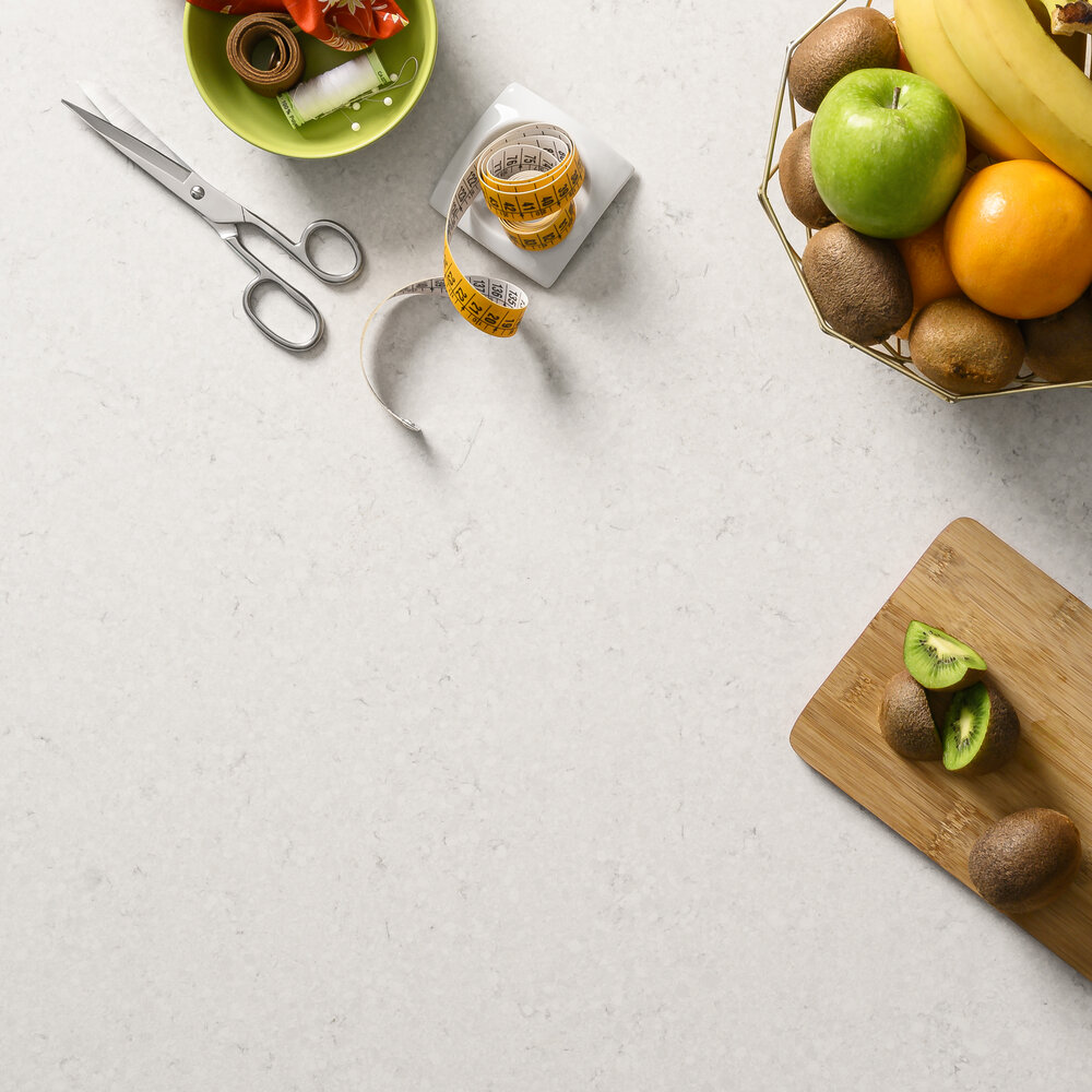 The Veined Canova surface has a uniform white background, a fine grain and widespread light grey veins.