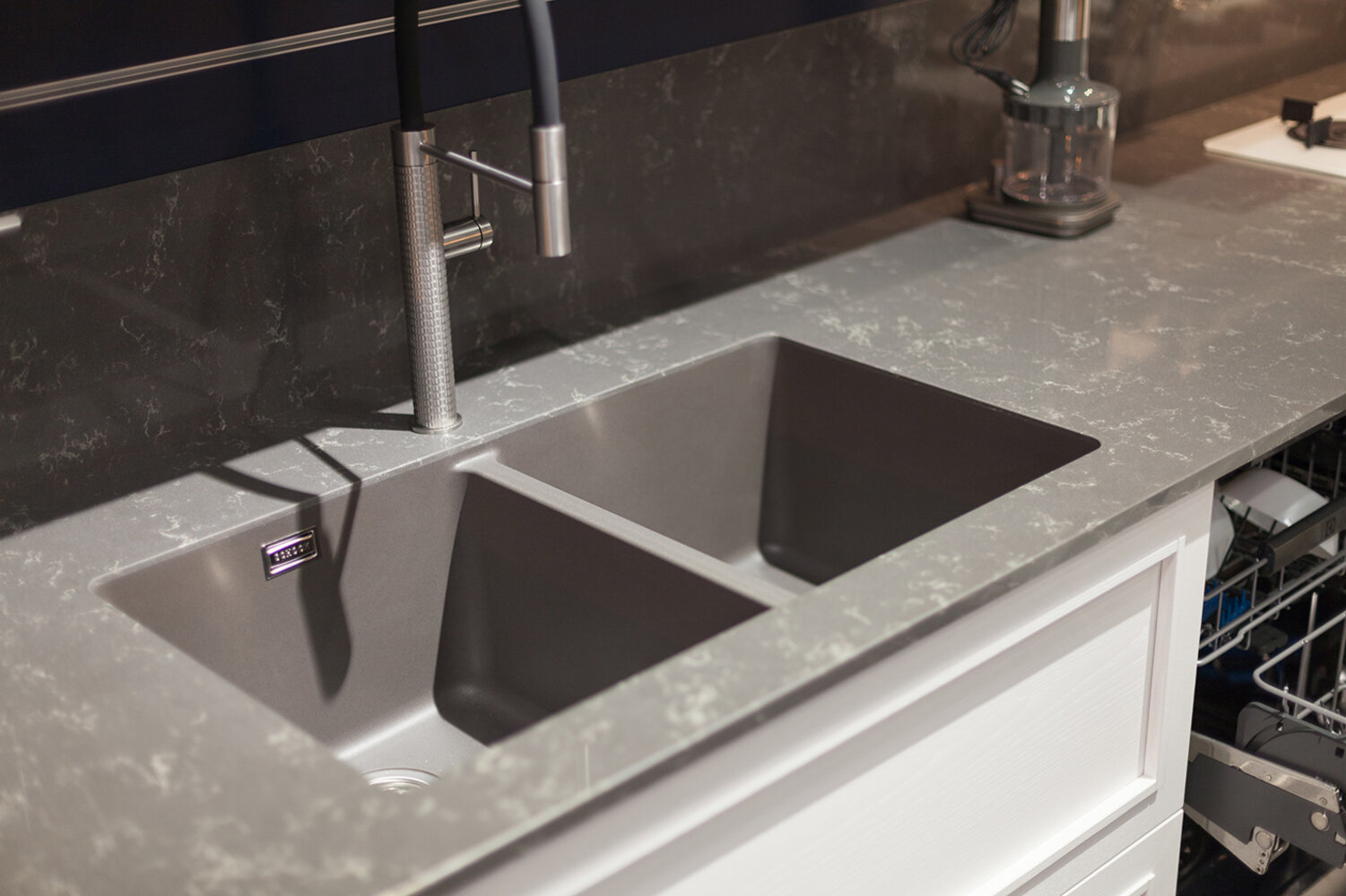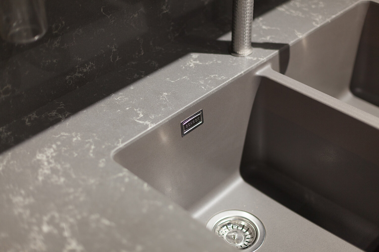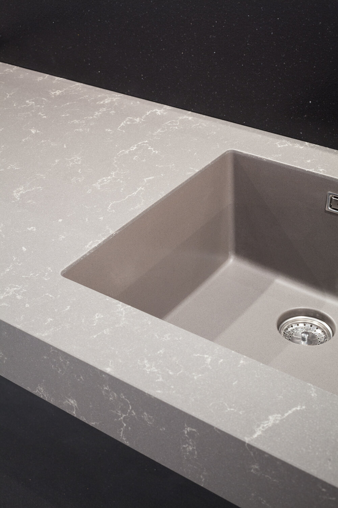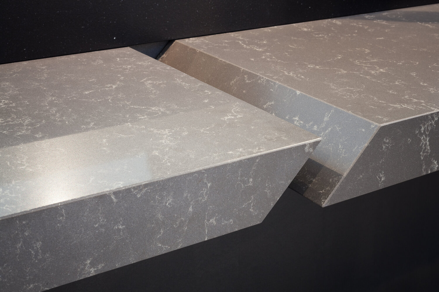 La surface Breeze Hull a un fond uniforme gris foncé, un grain fin et des veines diffuses gris clair.