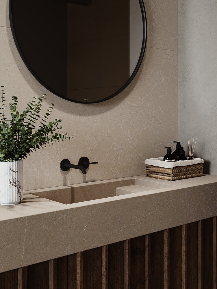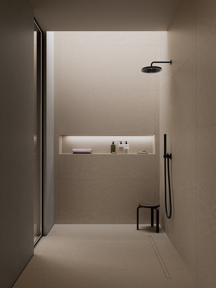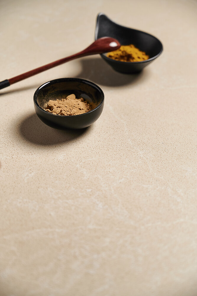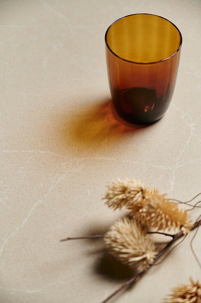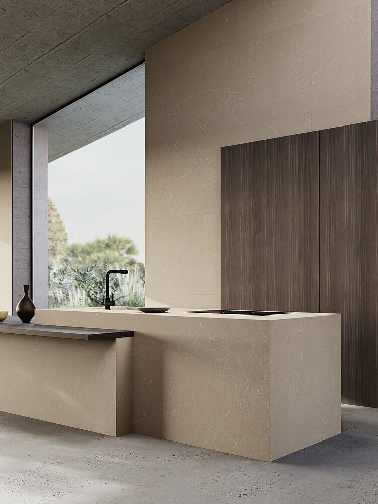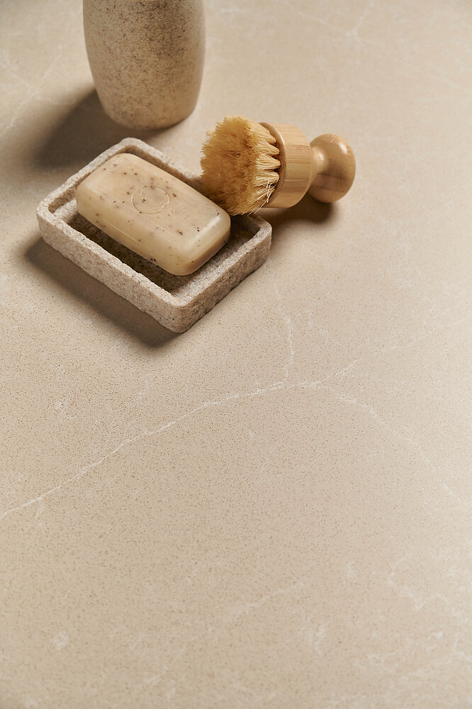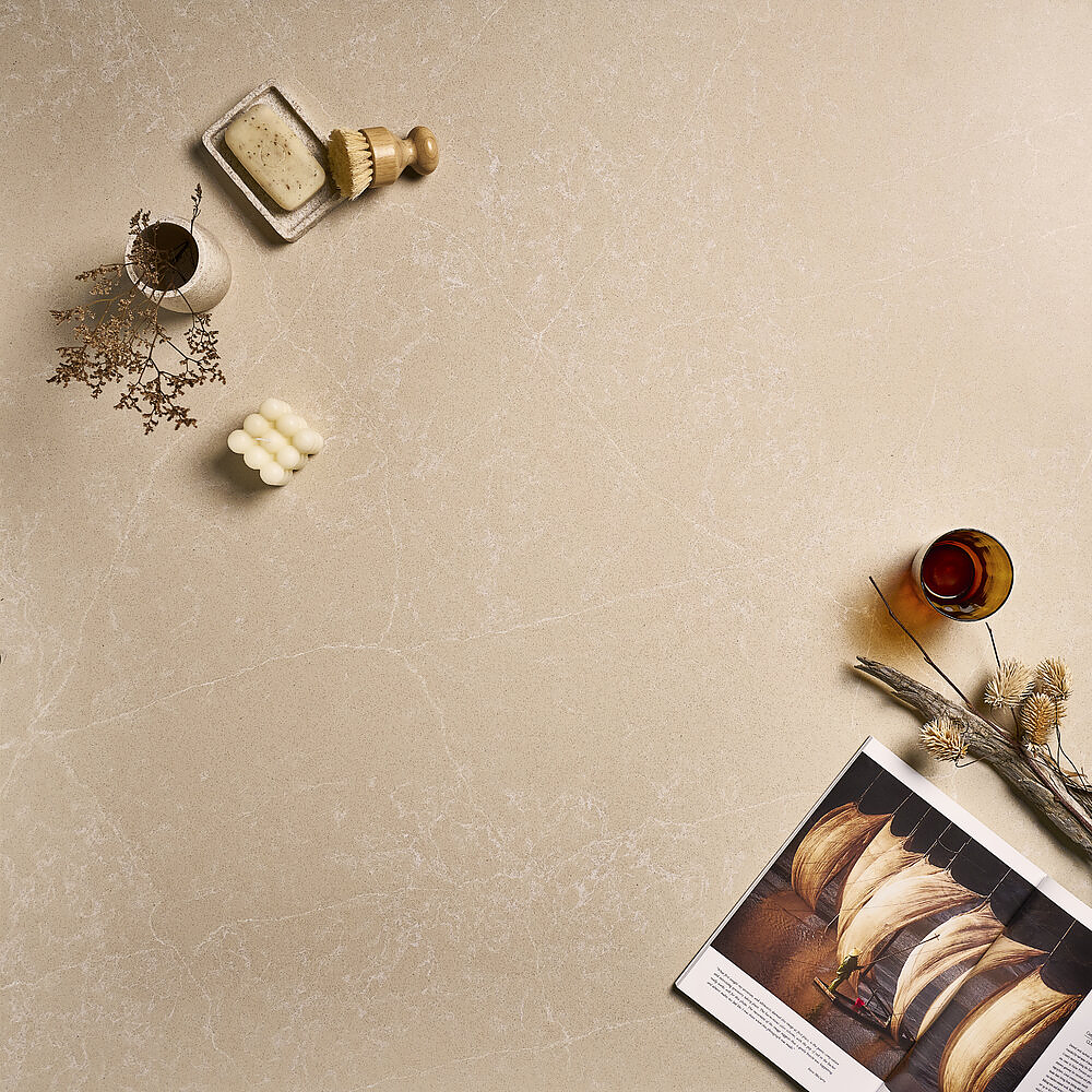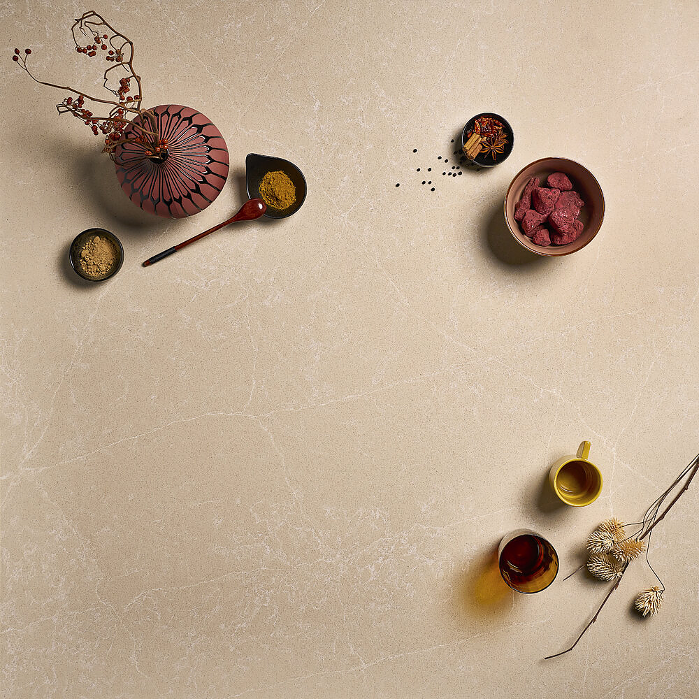 La superficie New Era Mahal ha un fondo uniforme color beige, una grana fine, venature lunghe di colore bianco e vene diffuse bianche.