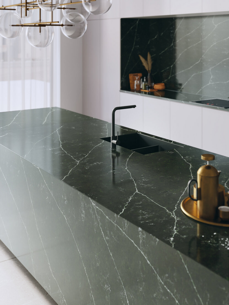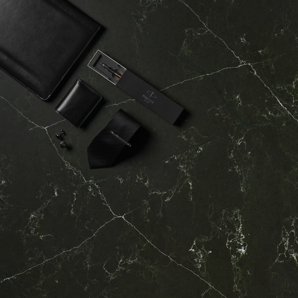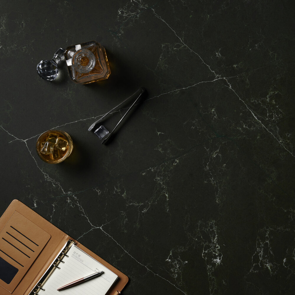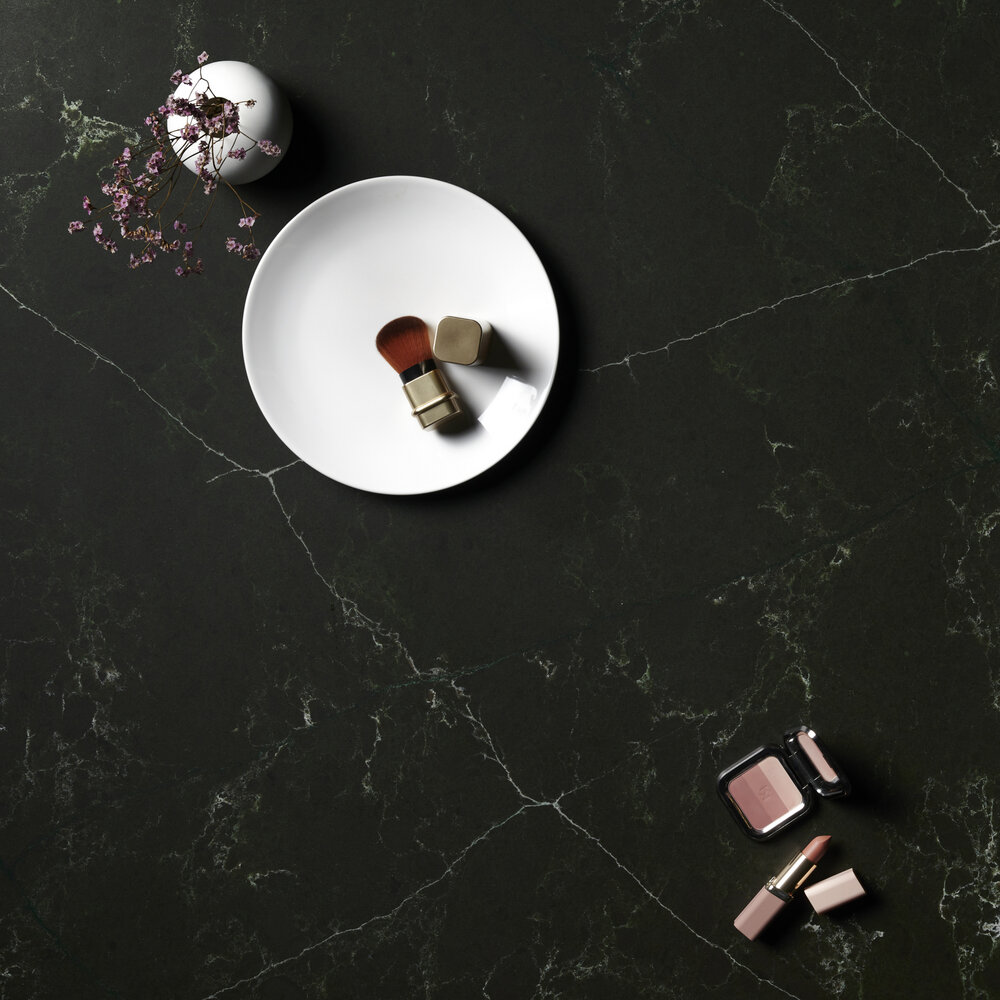La surface de Forest Magnolia a un fond noir / vert uniforme avec un grain fin, de longues veines blanches diffuses.