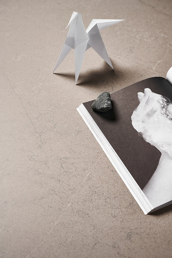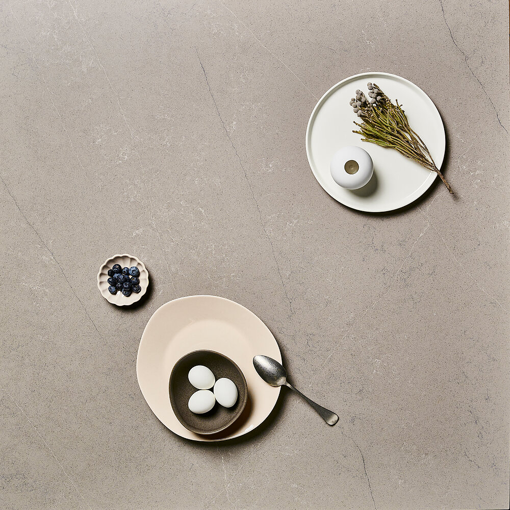 La surface New Era Mystic possède un fond uniforme de couleur grise/tourterelle, un grain fin, de longues veines grises et blanches et un veinage diffus blanc.
