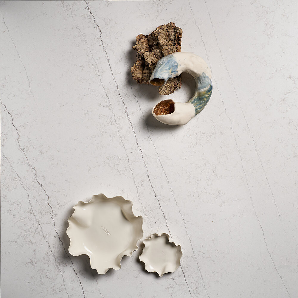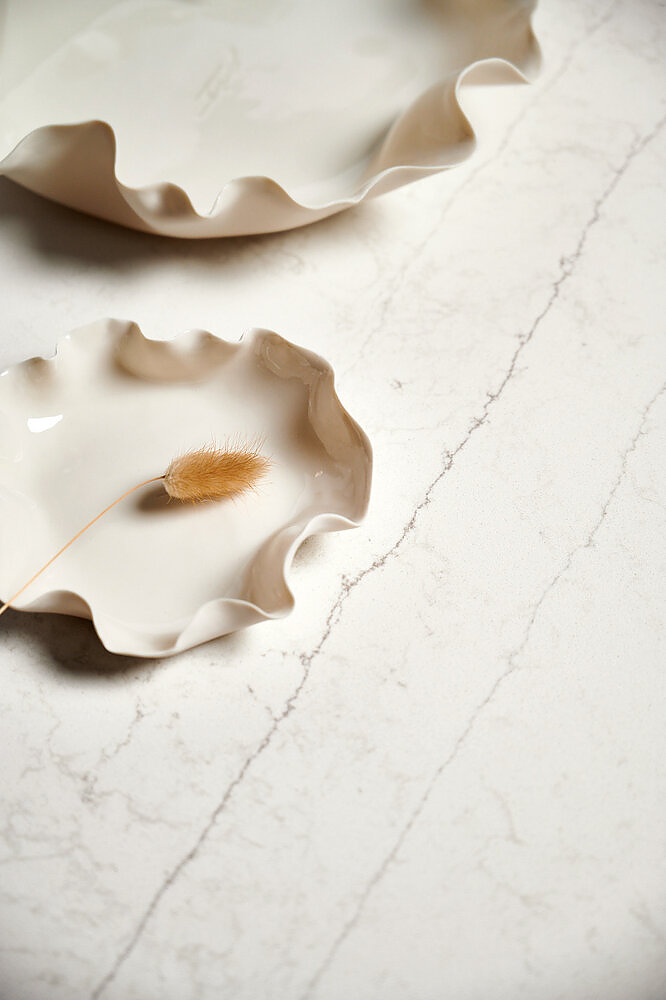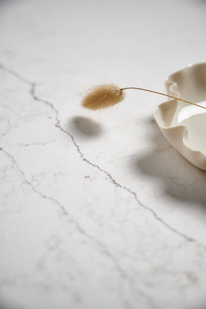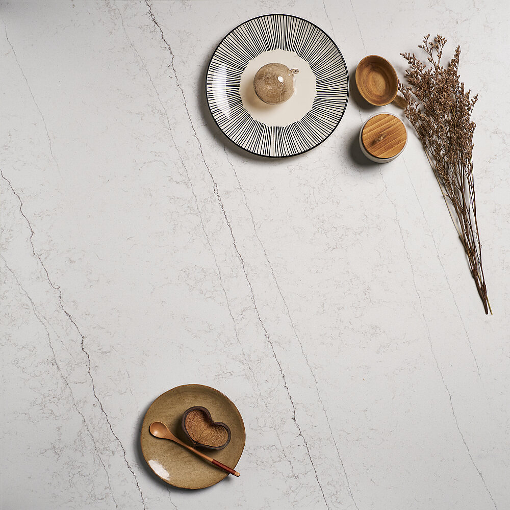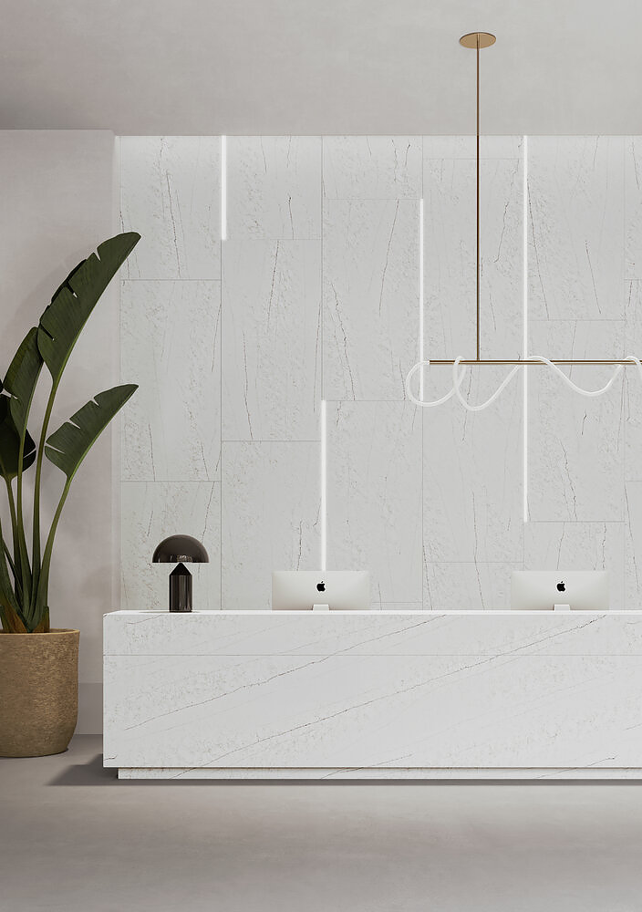 La superficie New Era Lasa ha un fondo uniforme color bianco caldo, una grana fine, venature lunghe di colore tortora e vene diffuse tortora tenue.