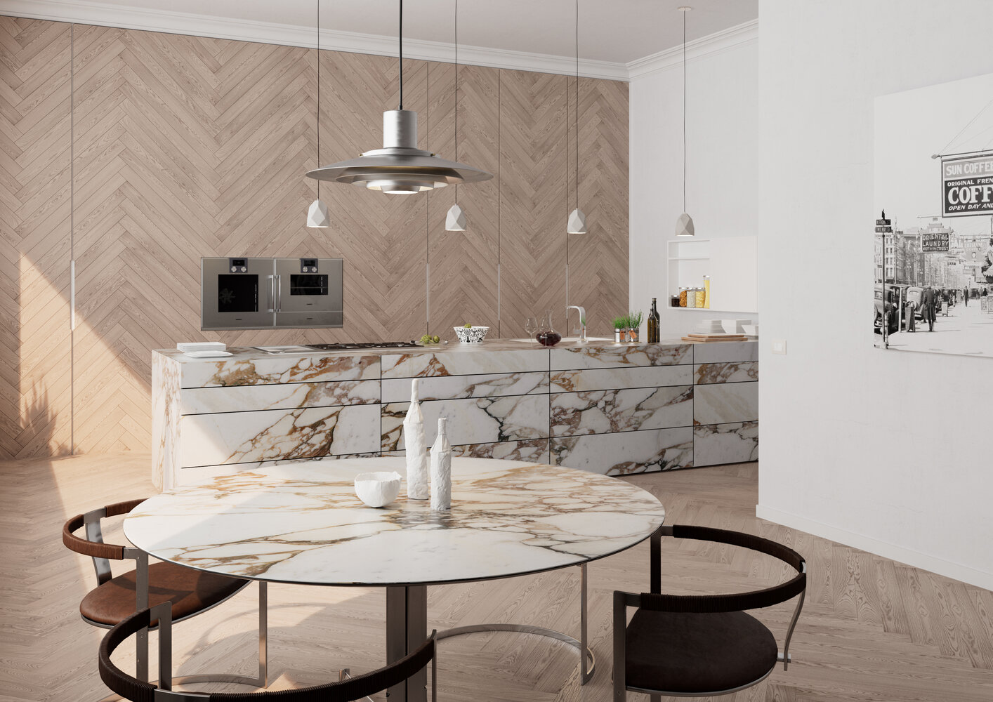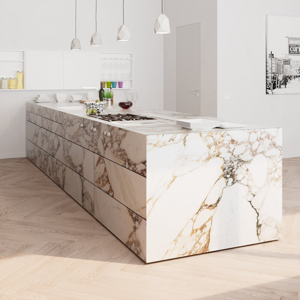 Quando si vuole stupire con un marmo che dia un autentico senso di preziosità, ricorriamo al colore aureo delle venature. La lastra Calacatta Vagli Oro le integra perfettamente a uno sfondo di una purezza quasi magica, per un effetto di rara bellezza.