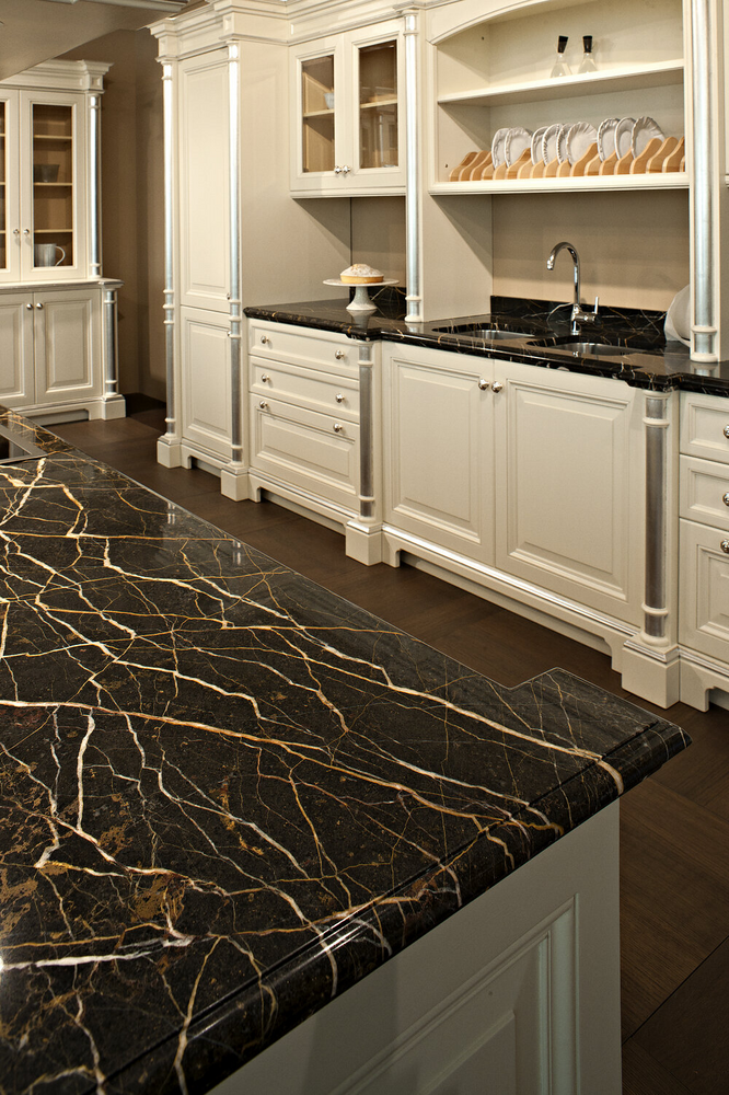 Decorare gli interni con le lastre di marmo Noir Saint Laurent significa evocare le divinità della bellezza, dando loro uno sfondo nero solcato da venature bianche e dorate. L’effetto è di sicuro impatto visivo, per chi desidera calore e preziosità allo stesso tempo.