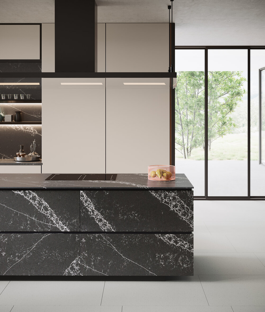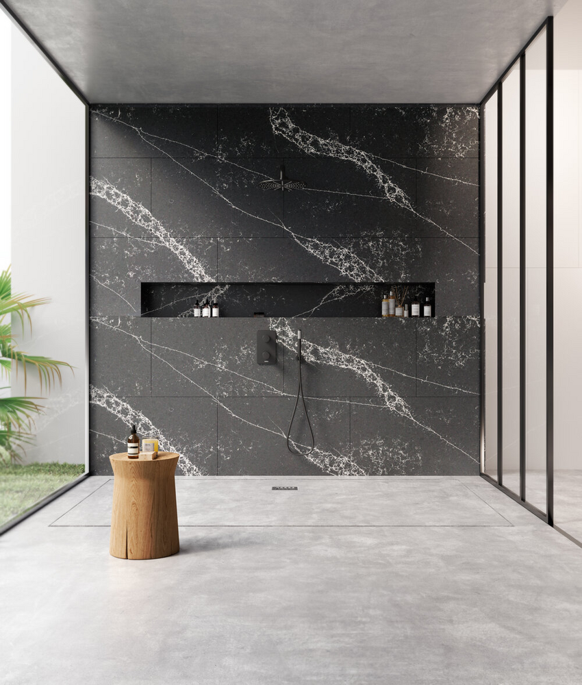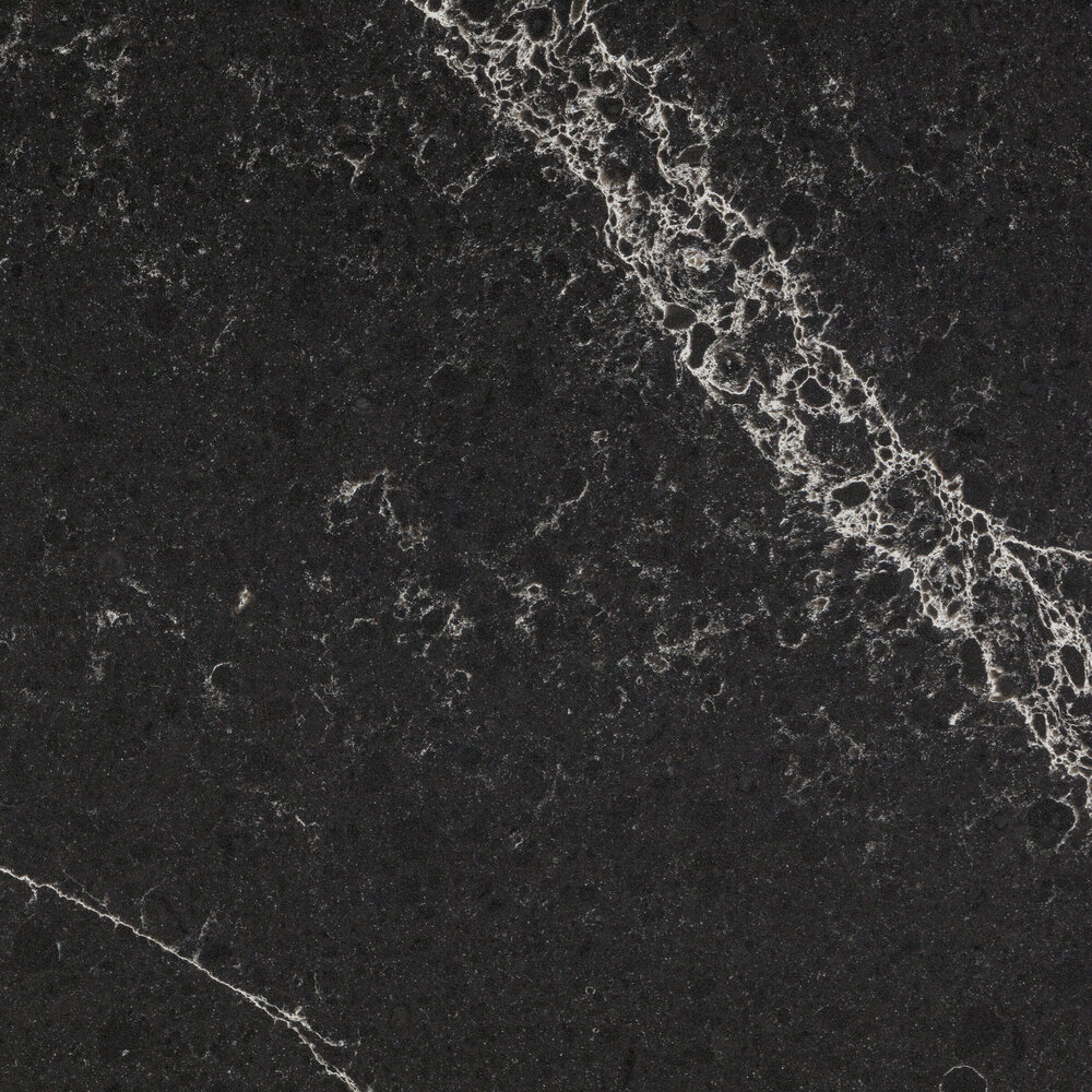 La superficie Ocean Midnight ha un fondo uniforme nero, una grana fine, venature lunghe e spesse di colore bianco.