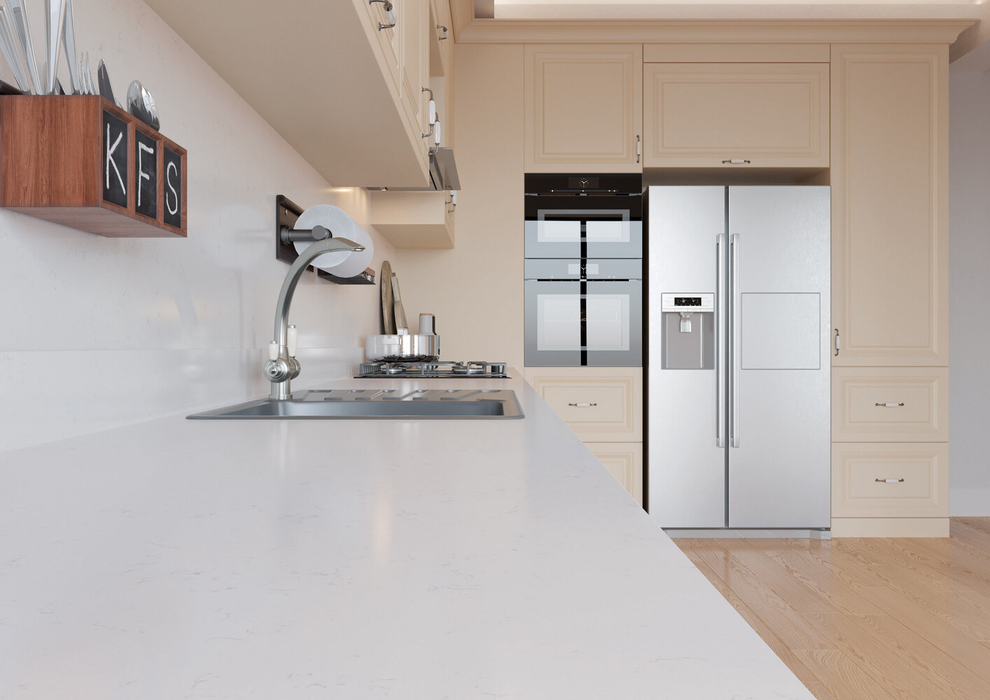 La superficie Veined Bernini ha un fondo uniforme bianco, una grana fine e venature diffuse grigio scuro.